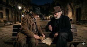 Y el amigo que espera con lo puesto. Se sientan a hablar de lo más alto (los Dioses) y de lo más bajo (el hambre), porque en la vejez de la sabiduría, esos dos puntos se tocan. “Él hambre es el Dios de los que no tienen nada, y los Dioses son el hambre de los que lo tienen todo. “Es una escena de una quietud monumental. El saco marrón contra el banco frío, y la pregunta lanzada al aire como una moneda de oro en un basurero. El amigo judío mete la mano en ese saco de tela marrón, un bolsillo que parece contener el tiempo mismo, y extrae los dos elementos que sostienen el mundo en esa plaza de perfumes vacíos.